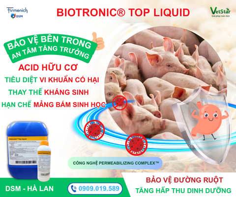 Hiện nay, Vetstar phân phối Biotronic® Top Liquid – sản phẩm độc quyền từ sản phẩm độc quyền của DSM (Hà Lan)– là giải pháp vệ sinh và cải thiện hệ thống cho ăn lỏng được tin dùng trên toàn thế giới, với những ưu điểm vượt trội:
